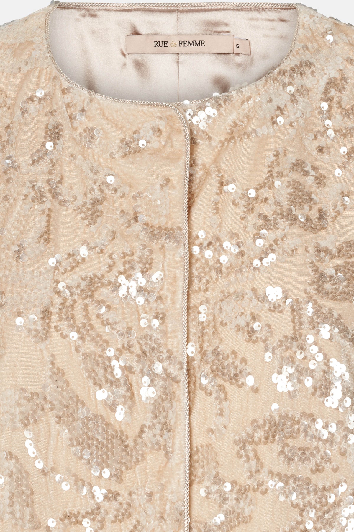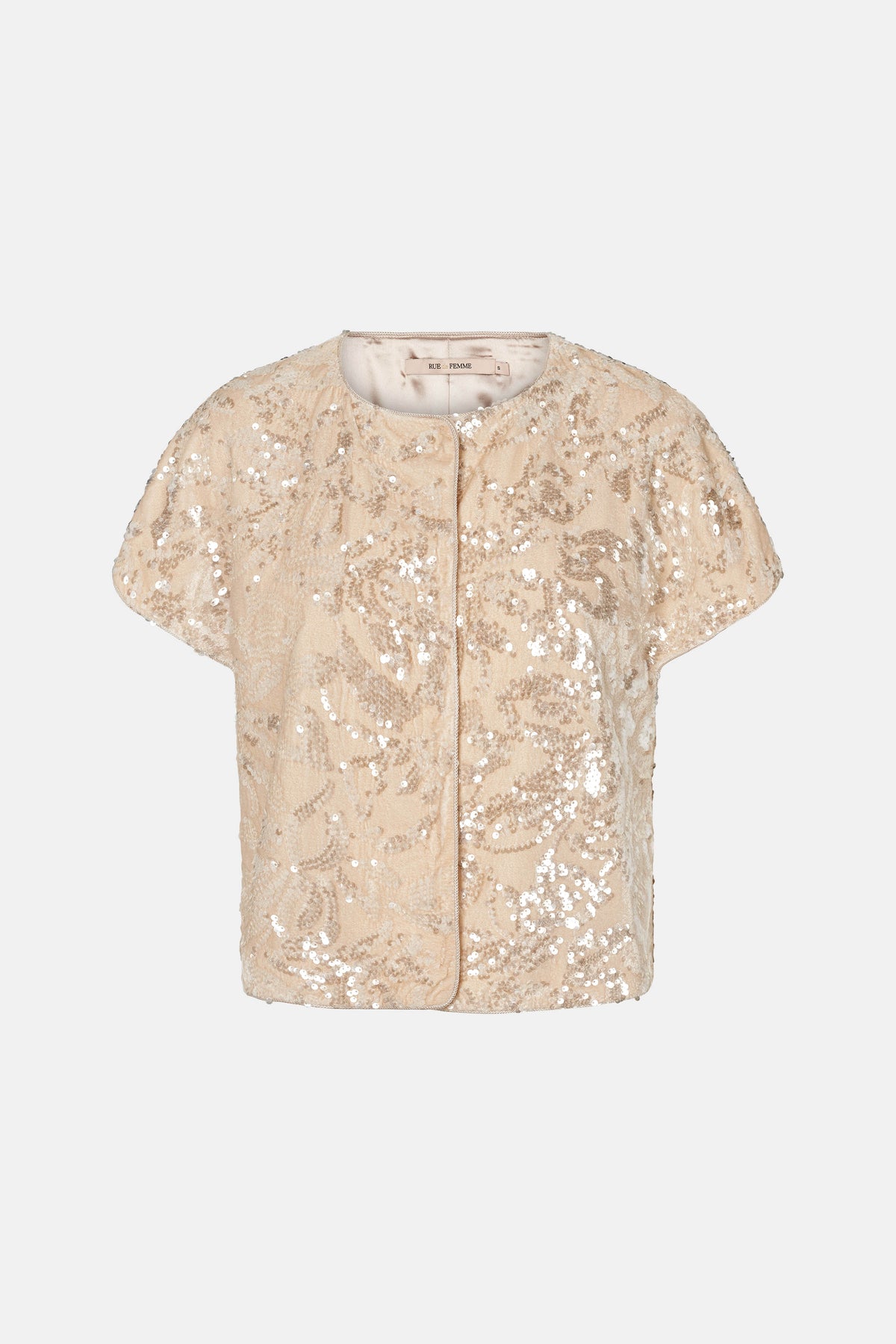 7591RDFHika er en elegant vest med korte ærmer og diskret lukning foran. Det raffinerede design med skinnende pailletter giver en luksuriøs og feminin silhuet.