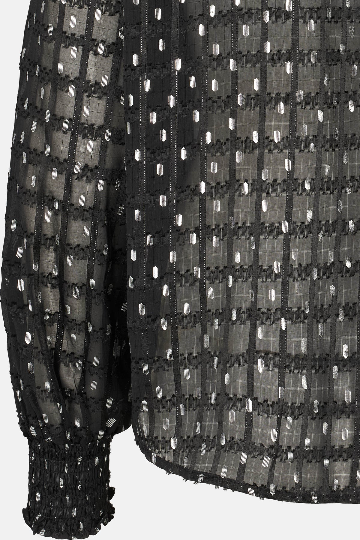 7675RDFCilja bluse er en elegant mønstret bluse med høj hals og feminine detaljer. Blusen har lange ærmer med smock og små flæser, der giver et let og sofistikeret udtryk. Det transparente materiale med vævet struktur og små kontrastprikker tilfører et moderne og eksklusivt look.