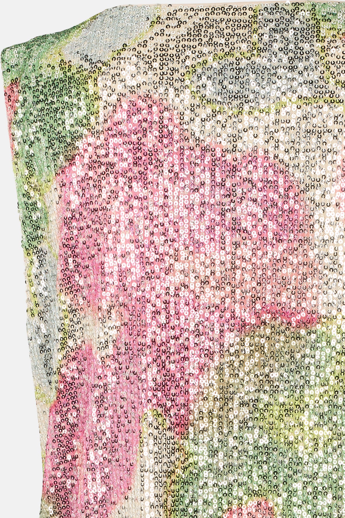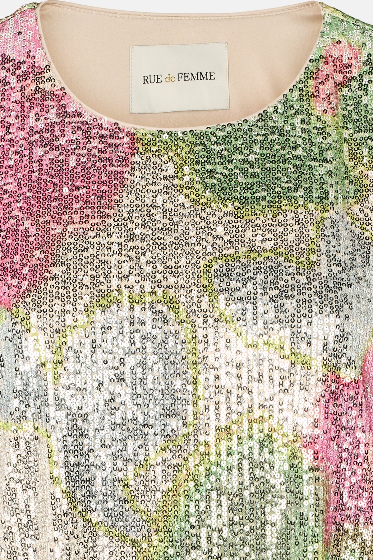 7698RDFAnikka kjole er en festlig og elegant kjole med en lige silhuet og et iøjnefaldende udtryk. Den glitrende overflade og det blomstrede mønster skaber et moderne og eksklusivt look.