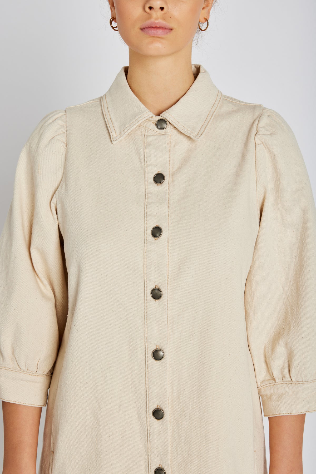 7707RDFOdessa kjole er en skjortekjole med et minimalistisk og struktureret udtryk. De halvlange ærmer og synlige knapper giver designet et moderne og afslappet look.