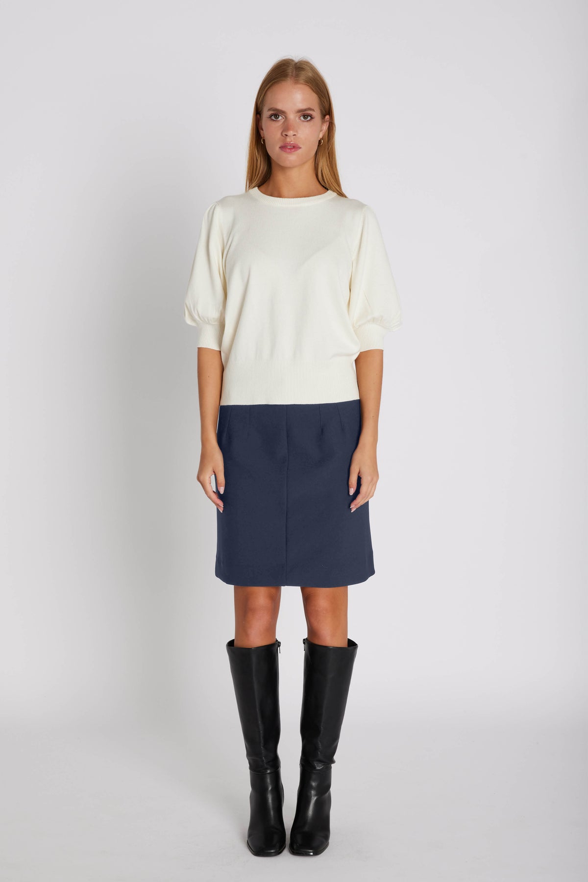 6801RDFOlana er en enkel og elegant mininederdel med ren linjeføring og høj talje. Den strukturerede form giver et skarpt udtryk med feminin kant. Style med en løs skjorte for et afslappet look, eller kombinér med en figursyet vest for et moderne og stilrent sæt. - Lynlås bagpå - Høj talje - Indsnit foran og bagpå - Kort længde Pasform: Almindelig Længde: Over knæet