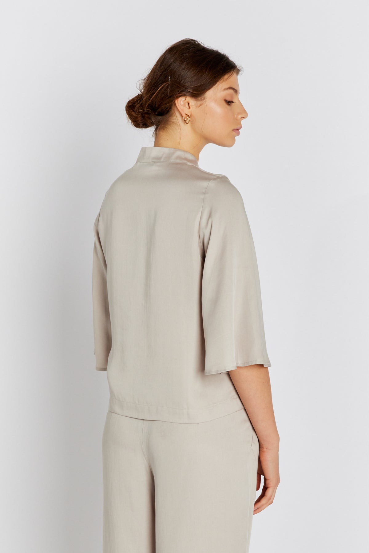 - Stående krave - Nøglehulsåbning med knap - 3/4-ærmer med vidde - Let og blød kvalitet