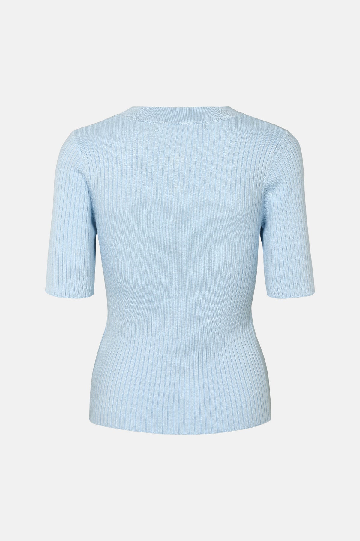 7493RDFFennec er en tætsiddende strikbluse med korte ærmer og en klassisk O-hals. Den dekorative knapstolpe giver et sofistikeret twist til det minimalistiske design.