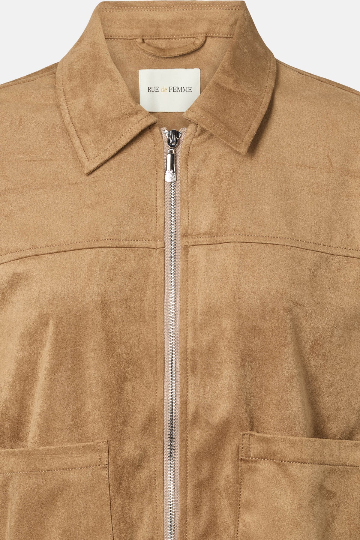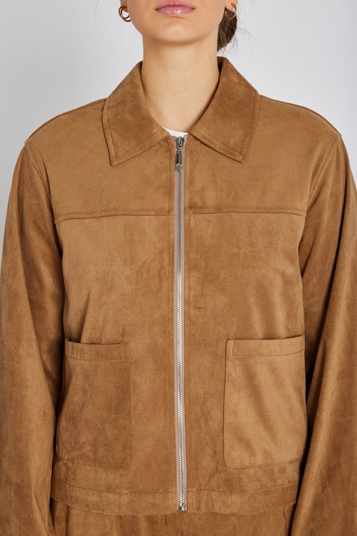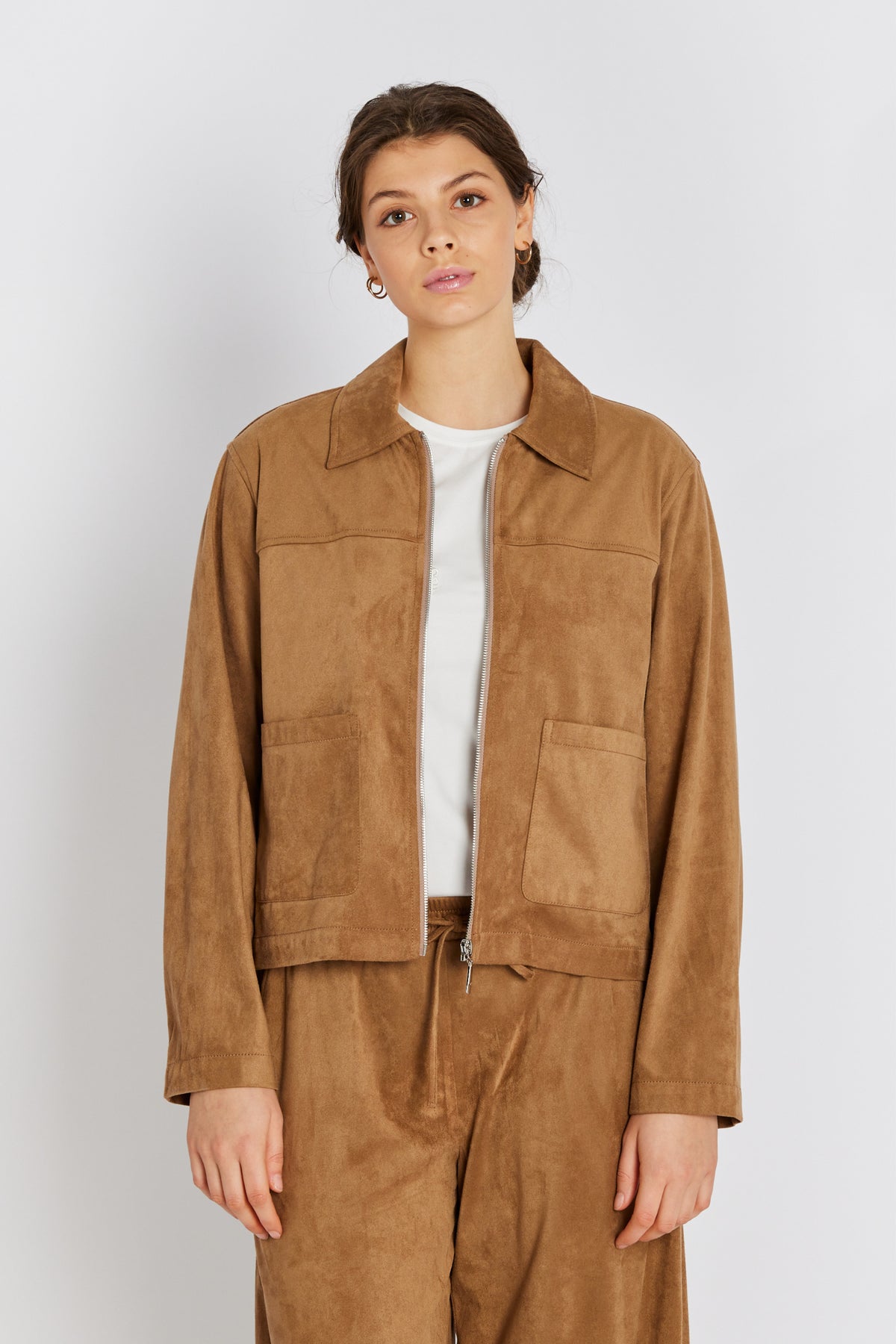 7710RDFGiselia jakke kombinerer et tidløst snit med et moderne udtryk i blødt imiteret ruskind. Den korte længde og de enkle linjer skaber et elegant, afslappet look.