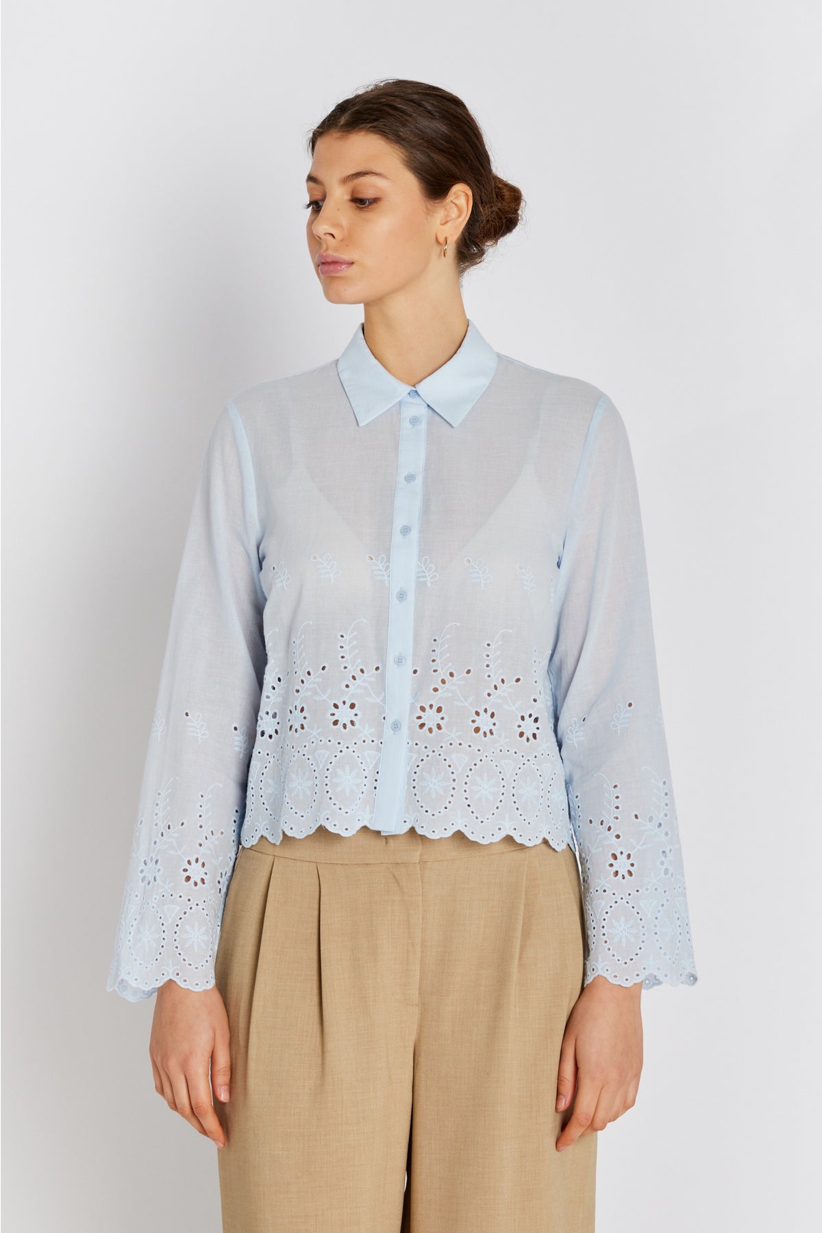 7709RDFJadea skjorte er en let og feminin skjorte med dekorative broderie anglaise-detaljer. Den korte længde og de fine afslutninger giver et moderne udtryk med klassisk charme.