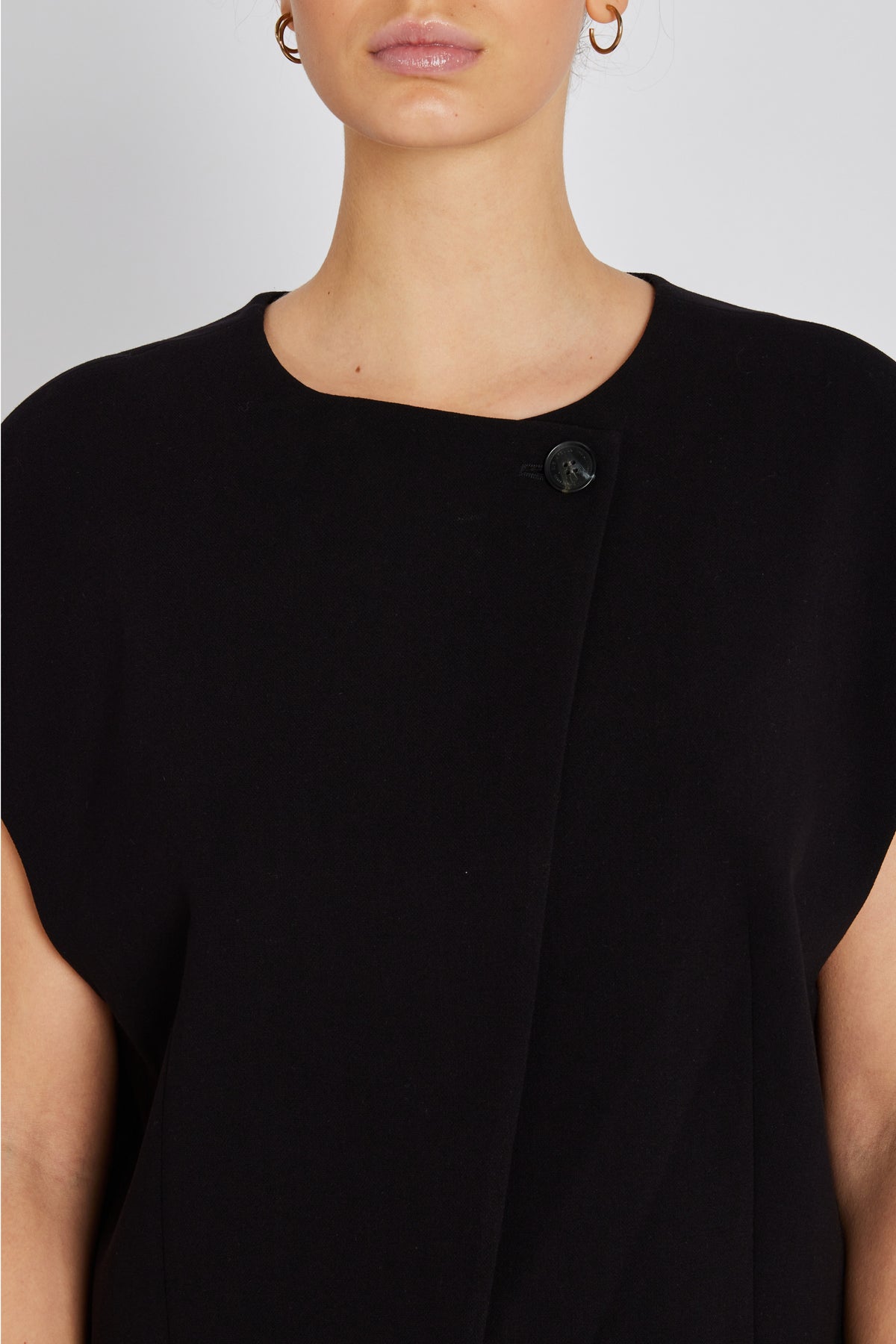 6800RDFKira vest er en elegant, ærmeløs vest med asymmetrisk front og enkel knaplukning ved halsen. Det strukturerede design giver et moderne udtryk med et feminint, skulpturelt twist.