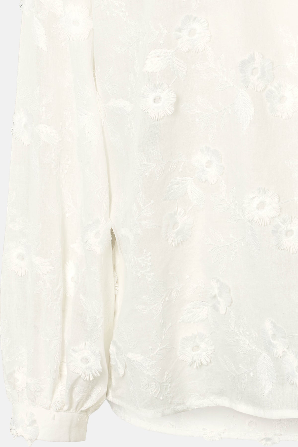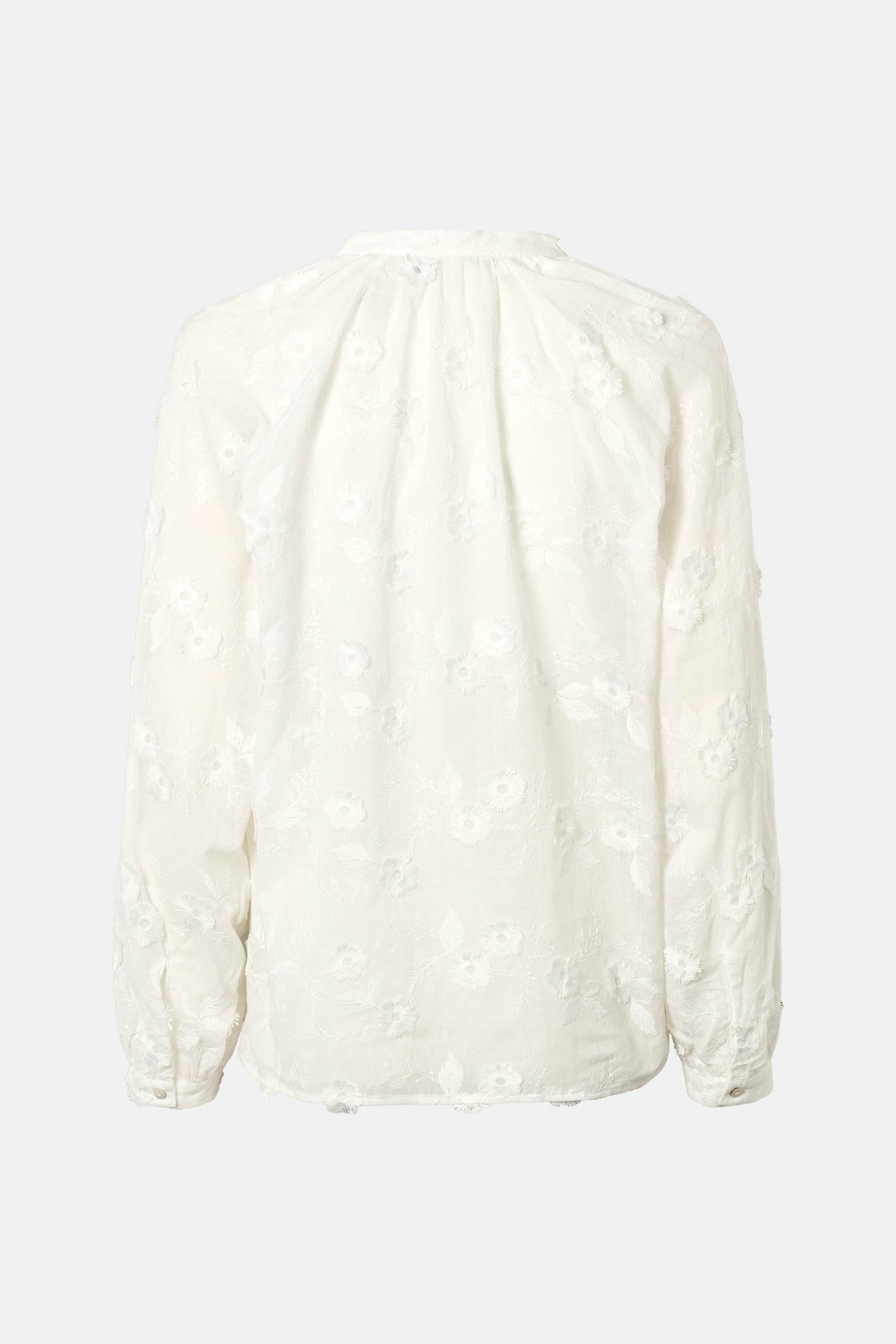 7669RDFSabra bluse er en feminin bluse med delikat struktur og diskret blomsterbroderi. Den har en let v-udskæring, små læg ved skuldrene og lange ærmer med manchetter, som skaber et blødt og elegant udtryk.