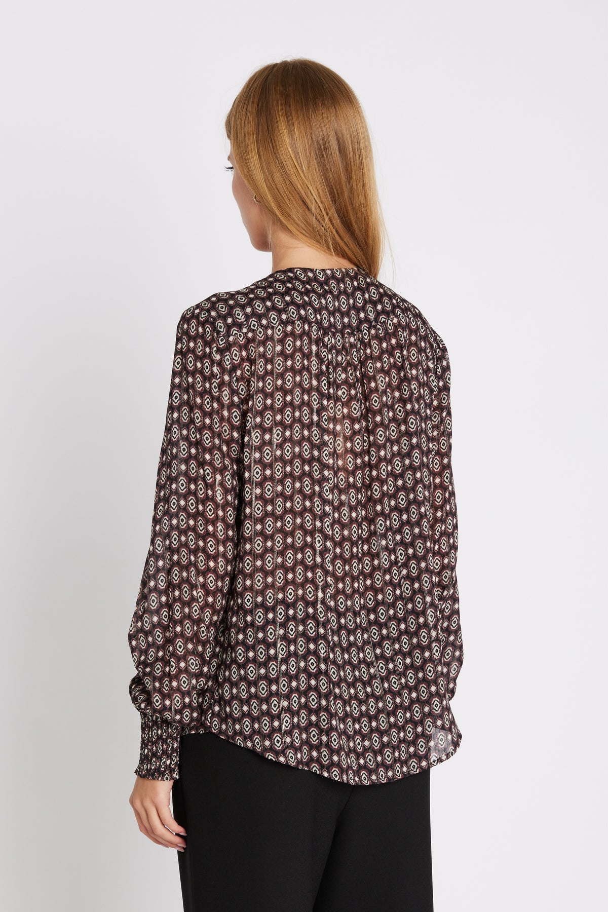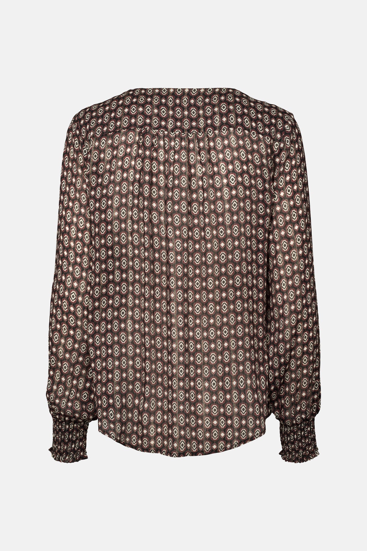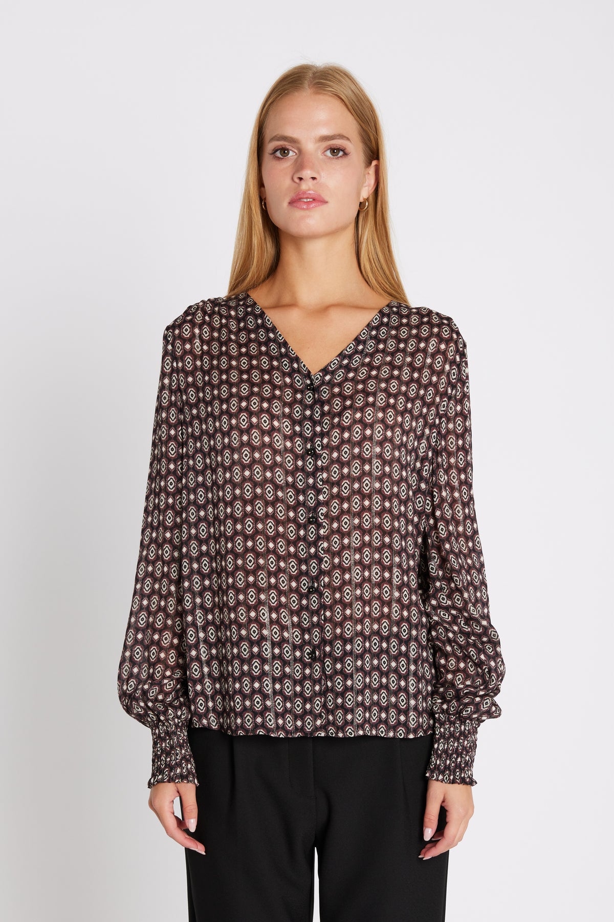 7618RDFVeda skjorte er en mønstret skjorte med V-udskæring og lange ærmer afsluttet med smockmanchetter. Den lette silhuet og de feminine detaljer giver et elegant og moderne udtryk.