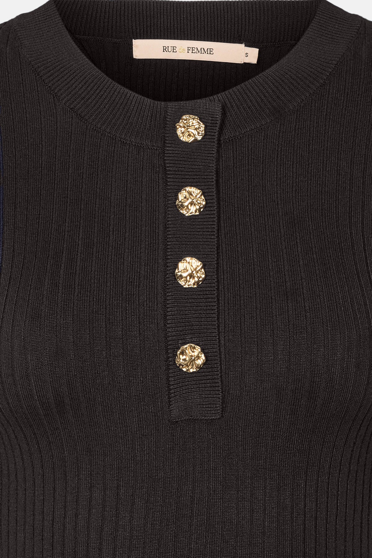 7493RDFFennec er en tætsiddende strikbluse med korte ærmer og en klassisk O-hals. Den dekorative knapstolpe giver et sofistikeret twist til det minimalistiske design.