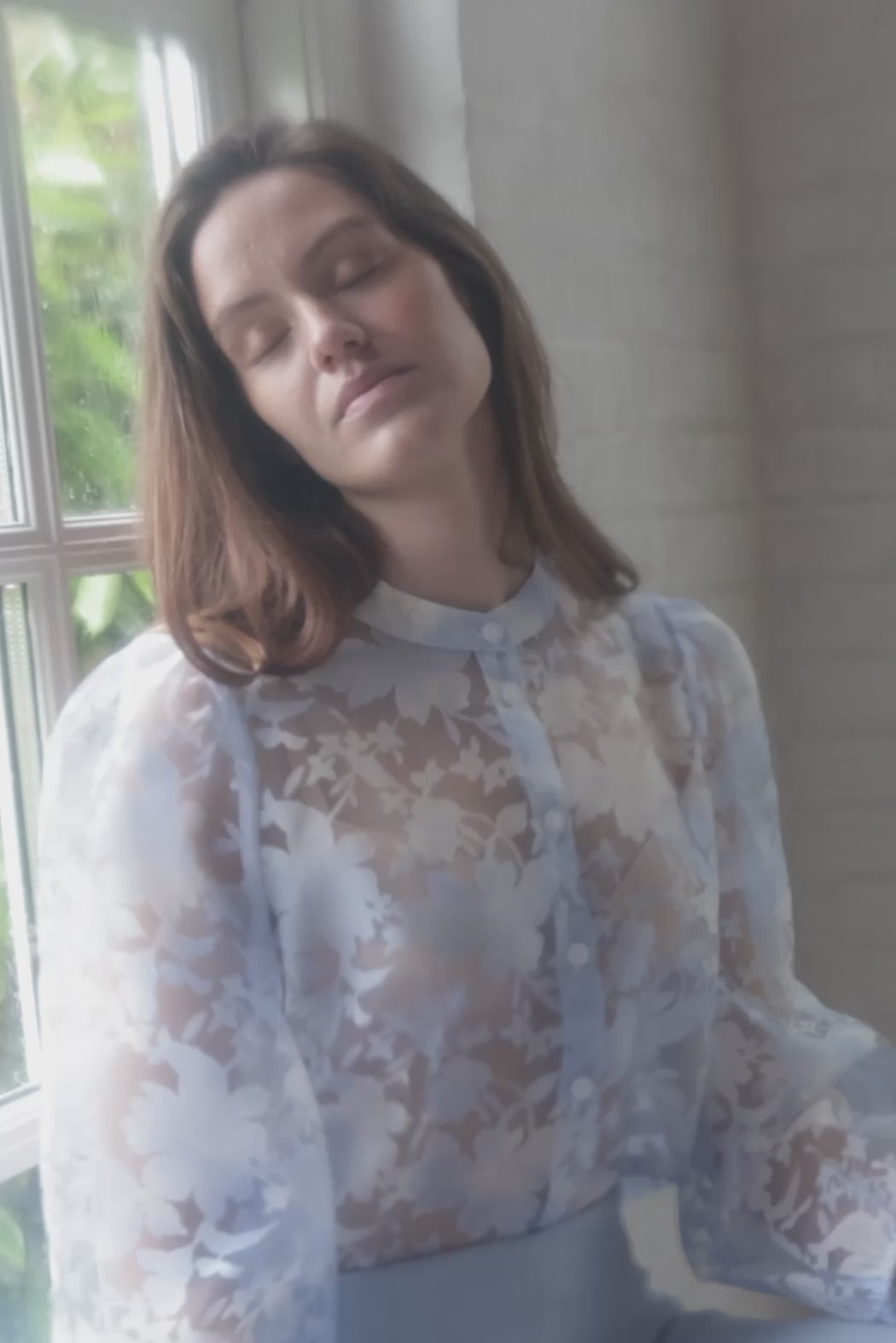 7691RDFSerene shirt is a light and elegant shirt featuring a subtle floral texture and voluminous sleeves. The semi-sheer surface adds a feminine and modern feel.