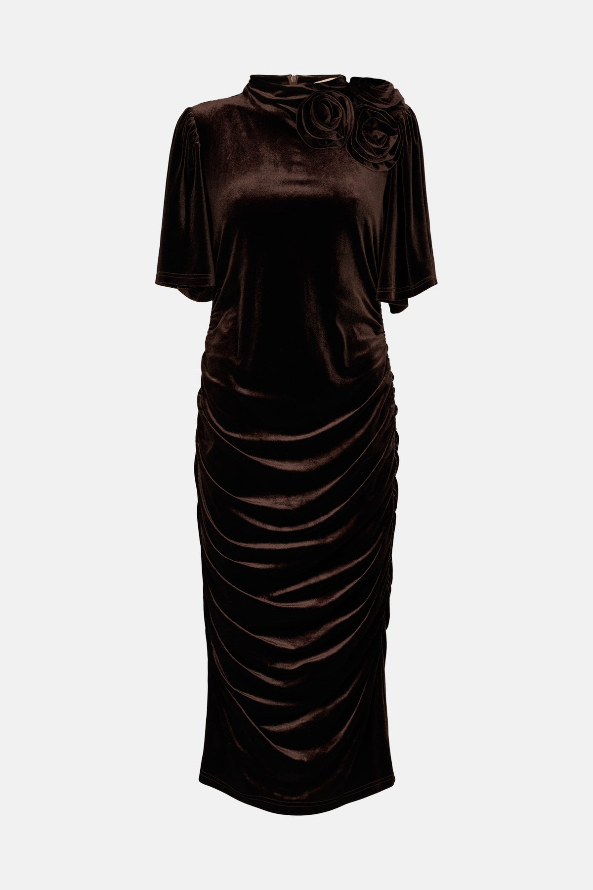 7427RDFLena is an elegant dress with sophisticated draping and decorative floral details at the shoulder. The design creates a feminine expression with a refined focus on the silhouette.