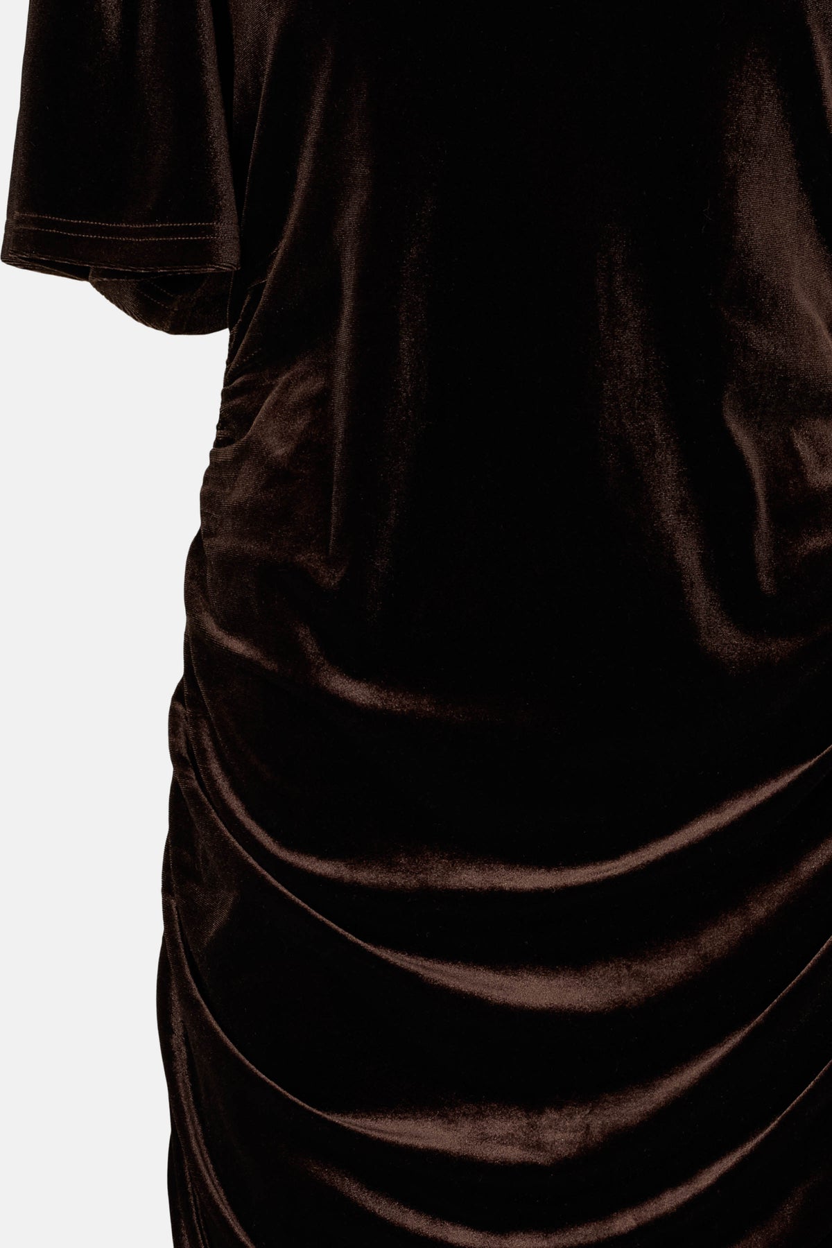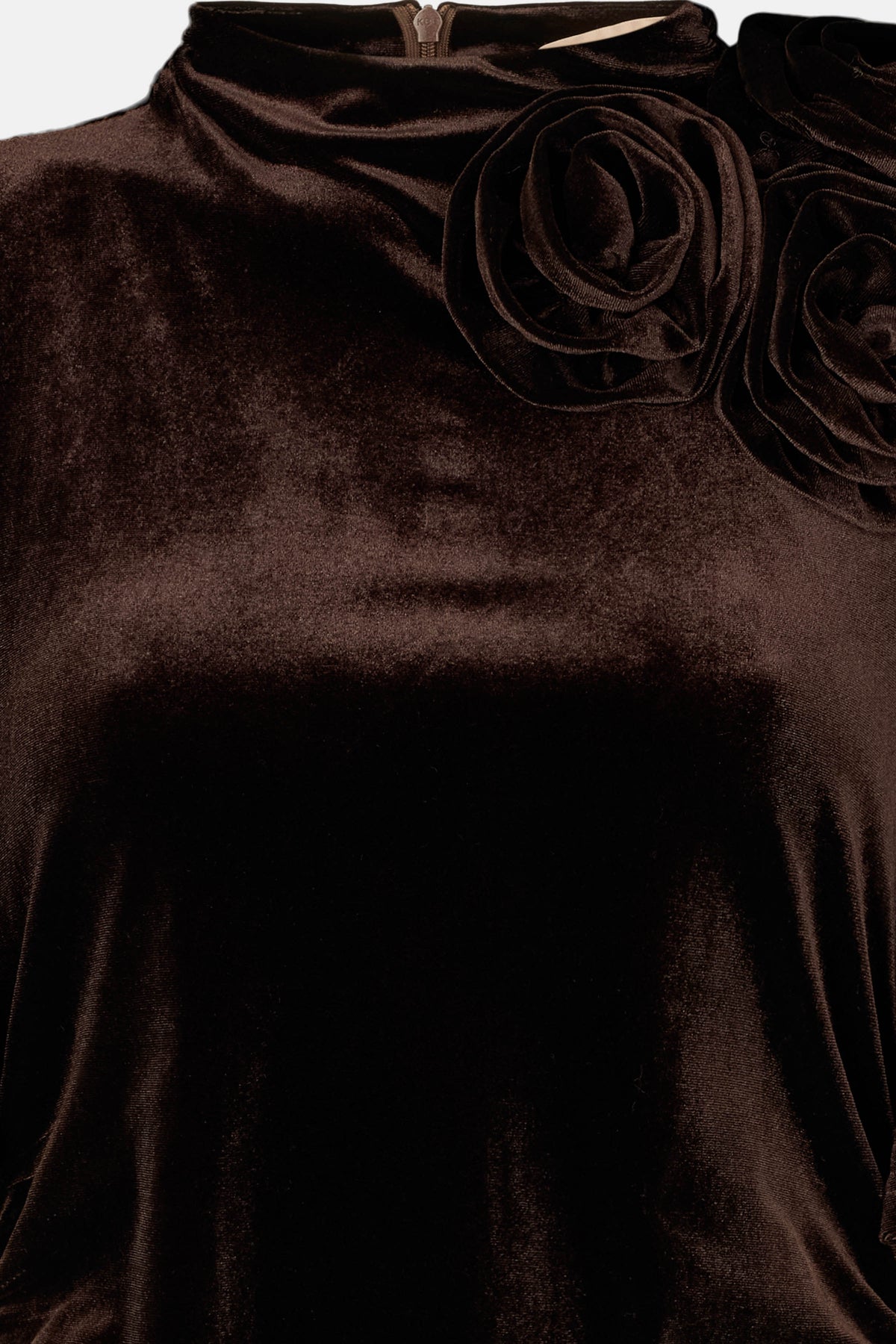 - Draped effect along the sides - Decorative floral details at the shoulder - Short sleeves - Hidden zipper at the back