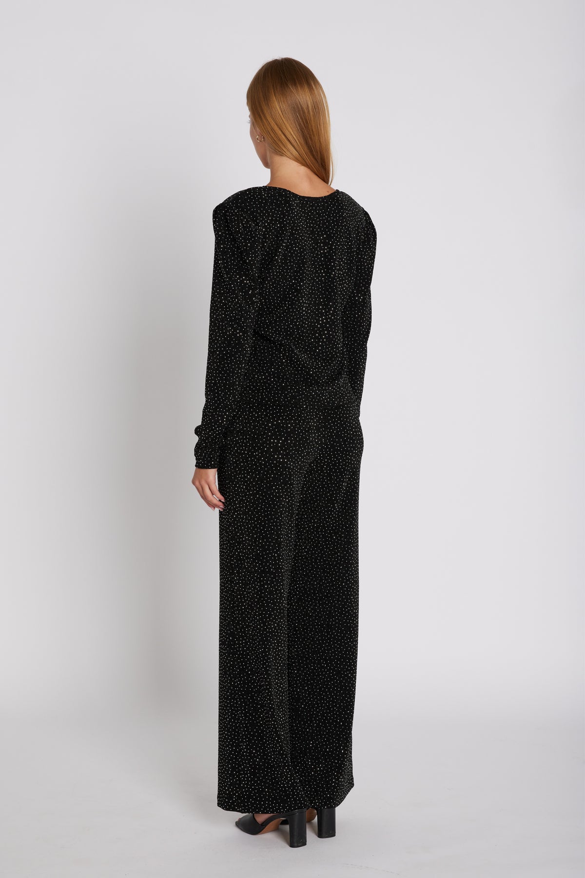 7633RDFOlana vide bukser er et par elegante bukser med brede ben, designet i et festligt materiale med små glitrende sten. Den løse silhuet giver et let og flydende fald, mens den elastiske linning sikrer en behagelig pasform og fleksibilitet.
